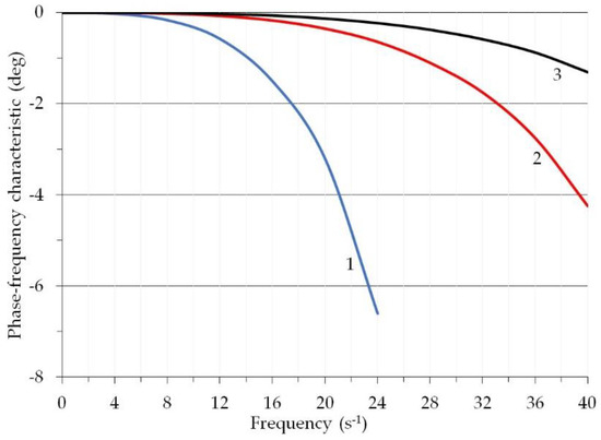 At the same time, a significant difference between the obtained phase–frequency characteristics takes place at the frequencies of external perturbation oscillations greater than 25 s−1. As is known, this frequency interval [27] is characterized by sufficiently small values of the dispersion of the longitudinal field profile’s vertical oscillations. Taking this into account, we can state that the real effect of changing the construction parameter L has no significant influence on the value of the delay in the response of the frontal mower to the action of the external disturbance in the form of vertical oscillations of the field’s longitudinal profile.