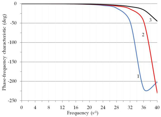 Phase–frequency characteristics of the dynamic system during the performance of the disturbance at different values of the parameter : curve 1, L = 3.8 m; curve 2, L = 4.3 m; curve 3, L = 4.8 m.