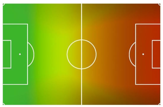 A pass always moves the ball from one point on the field to another. There are coordinates of the start and end of the pass. In order to quantify the coordinates, the flag area at the lower left corner of the field is taken as the origin of the coordinates. The long axis of the football field is the x-axis with the x value variation range [0, 100], and the short axis is the y-axis with the y value variation range [0, 100]. The z-axis variation caused by the long pass is not considered. In the coordinate system of the football field, the center point of the goal coordinate of the one side is (0, 50), and that of the other side is (100, 50). The coordinate system of football field reflects the abstract relationship between two-dimensional numerical value and football competition. The difficulty and contribution of the pass increase with the increase in x value, and change with the positive correlation between y value in [0, 50] and negative correlation between y value in [50, 100]. The potential value of coordinates is represented by color saturation, and the darker the color, the higher the potential value, as shown in Figure 2.