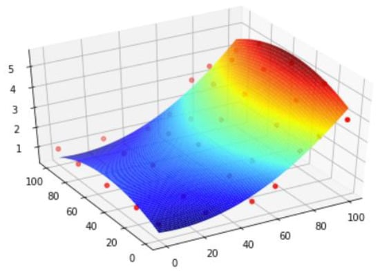 In Figure 2, the degree of color gradient shows that when the y value is fixed, the potential value of the pass increases nonlinearly along the x-axis with the increase in x value. We calculate the ratio of successful passes for each position as the ratio of changes in the potential value of passes. The potential value of the pass in the backfield area of the own side is the minimum value 1. When the parallel line of the y-axis where the x value gradually approaches the line of the opponent’s penalty area, the potential value of the pass increases significantly. If and only if the coordinates are in the opponent’s penalty area, the potential value of the pass reaches a maximum value of 5 and does not change as the coordinates continue to approach the opponent’s goal. In order to quantify the relationship between the potential value of passes and coordinate changes, we defined 22 important coordinates by taking into account the boundary of the field, the intersection of the field line, and the arithmetic midpoints of the coordinate system. The value of each close coordinate is defined by the ratio of the average number of passes of third-line players. Taking the x and y coordinates of the important coordinate set as independent variables and the value set as dependent variables, the multivariate nonlinear regression equation is established and the regression image is shown in Figure 3. In order to avoid the value crossing the boundary, the value interval obtained from the multivariate nonlinear regression equation is [1, 5]. For a few values whose fitting values are located at (0, 1), and those located at (5, +∞), the coordinate-based regression equation for the potential value of a single pass is obtained by taking 1 and 5, respectively.