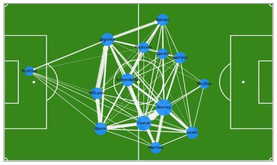 In a high-level league, a team with the most possession in a game can pass an incredible number of passes. Premier League champions Manchester City played Manchester United (744 and 528 passes per game, respectively) with a high passing rate that had a positive impact on the result. Although high-level football teams have more passes and can contribute a larger data set of passes, the accumulation effect of the stars in the team can guide the progress of the game and cover the tactical configuration effect of the stars in the team, and especially cause a dominant effect to team offensive efficiency [26]. As a result, individual star performances can disrupt the internal balance of the team, and the interpretation of team performance by match results can be diluted [27]. Based on this, in order to better reflect the overall performance of the team, we choose Everton, which has been in the middle of the Premier League for a long time, as the research object. In 2017–2018, Everton finished eighth in the league, winning 13, drawing 10, and losing 15 in 38 games, scoring 44 goals, and conceding 58. As a veritable mid-table team, Everton is ideal for passing network analysis, with a small number of elite players (Rooney, Pickford) who satisfy the diversity of their players’ make-up, and a wealth of passing statistics (14,782 passes accumulated, 238 key passes accumulated, 389 passes per game).