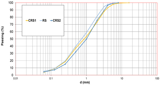 The treated products were recycled sand and recycled gravel manufactured at the Aggneo® recycling platform in Saint-Fons. The recycled sand and gravel were obtained via simple crushing of hardened concrete that came from ready-mix concrete returns. This process resulted in the production of aggregates of different sizes: 0/4 and 4/16 mm. The particle size distributions of these RCAs are given in Figure 1 and Figure 2. Homogeneous batches from the same productions were constituted and distributed at the two pilot sites (rotating drum and fluidized bed).