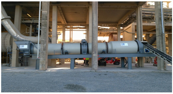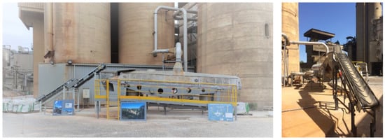 The demonstrator installed at the LafargeHolcim plant in Val d’Azergues (Figure 5) was also described in a previous paper [10]. It was a fluidized bed dryer adapted into a cross-flow reactor for the occasion, with the cement plant gases directly treating the recycled concrete aggregates. It was directly connected to the cement plant gases by metal pipes. The plant gases (CO2 content of about 20%) were tapped into the main filter located upstream of the stack; therefore, an additional filter was placed at the reactor outlet to prevent any additional dust release at the plant stack.