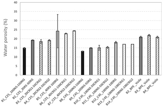 The main durability indicators (water porosity, chloride ion migration, gas permeability, and accelerated carbonation rate) were measured. Figure 9 shows that the concrete had a higher porosity with the rate of substitution with CRCA. This increase was of the same order of magnitude as that observed with the use of the same non-carbonated aggregates.