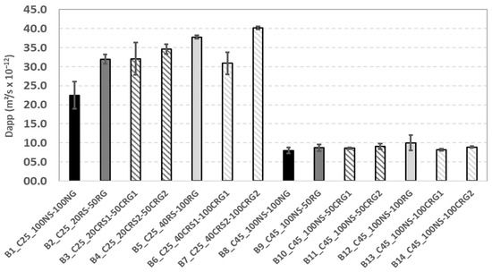 Regarding the diffusivity of chloride ions, the use of CRCA did not lead to any notable and systematic effects (Figure 10). Concretes made with recycled aggregates, whether carbonated or not, corresponding to strength class C45 had diffusivities equivalent to concrete made with natural aggregates. Similar results were observed for the carbonation rate. Concerning the risks associated with reinforcement corrosion, the use of CRCA can therefore be considered in the same way as the use of RCA. These results highlighted the contribution of greater compactness of the cementitious matrix and confirmed the relevance of reducing the water-to-binder ratio (W/B) when the incorporation rates of recycled aggregates (carbonated or not) were high.