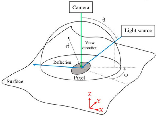 The stitching algorithms aim to detect a high gradient but they are statistically less present in topographies than in images. A data type fulfilling the high gradient condition is a reflectance map, which is used in the new developed stitching algorithm. In this new algorithm, reflectance maps are obtained by simulating the reflectance on the surface topographies measured by the profilometers. The reflectance simulation is based on Phong’s model [56]. Figure 2 shows a scheme representing the principle of reflectance: a light source, located at a (θ, ϕ) position, is directed towards a surface and a camera receives the light reflected by the surface.