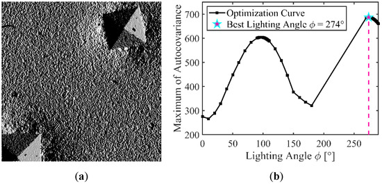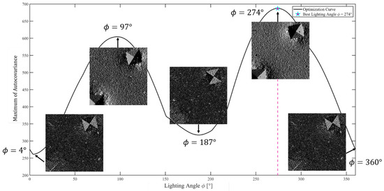 A simple approach is to compute the objective function for multiple angles, for example, the ϕ angles from 0° to 359°. Figure 4 sums up the optimization process of the reflectance in-plane lighting angle for an indented surface. The best lighting angle is determined when the value of the maximum of the autocovariance matrix is maximized, i.e., for a ϕ angle of 274°.