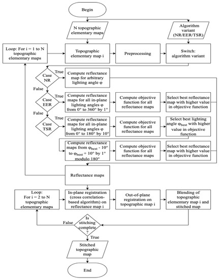 This strategy evaluates a lot fewer solutions compared to the exhaustive enumeration method, which results in a faster algorithm for an equivalent or greater precision. A speed comparison between the exhaustive enumeration optimization and the two-step optimization is provided in Table 3. Using the two-step optimization algorithm results in a significant gain of speed, roughly equal to six. A flowchart summing up the three variants of the rising sun 3D topography stitching algorithm based on reflectance and multimap is provided in Figure 6.