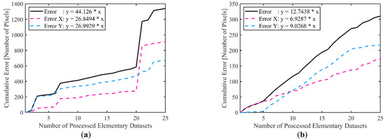 The hypothesis of linearity of cumulated errors in stitching is assumed, as statistically accumulated errors should be linear, given that measurement apparatuses have bounded uncertainties in displacement errors (also known as tolerance). In this hypothesis, it is then possible to assess stitching quality using a linear regression to compute how linear the error accumulation of each local stitching is. Sources of non-linearity are then mostly due to bad registration, sometimes resulting in stitching chain reaction failure, i.e., a bad local registration, which impedes the next local registration, makes the following ones increasingly difficult. Figure 7 shows the cumulative repositioning errors of the same set of elementary maps stitched with two different stitching algorithms: one that has failed (Figure 7a) and one that has successfully stitched the surface (Figure 7b). Linearity of the cumulative repositioning error is lower for the stitching algorithms that have failed registration of elementary maps. The numbers of the failed local stitching can be detected as the cumulated repositioning errors are locally higher, creating sharp edges on the cumulative repositioning error plot. The slope of the accumulated errors is then the mean repositioning error, which is used for the evaluation of the stitching quality in this paper.