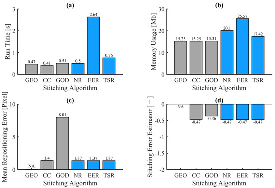 Bar charts of the quantitative criteria for test case B: run time (a), memory usage (b), mean repositioning error (c) and stitching error estimator (d). NA = Not applicable.