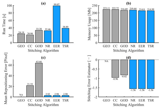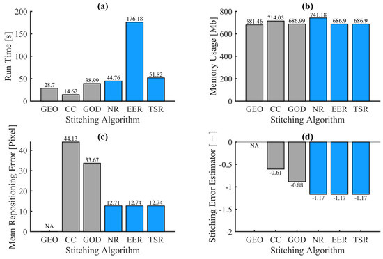 Figure 9 compares the six stitching algorithms based on the four quantitative criteria. Run time is higher for TSR algorithm, and even more for EER algorithm. Other stitching methods are close of each other’s. Memory usage is similar for GEO, CC and GOD algorithms, and higher for TSR, NR and EER, from lower to higher. GOD algorithm has an increased mean repositioning error and a lower stitching error estimator compared to CC, NR, EER and TSR algorithms.