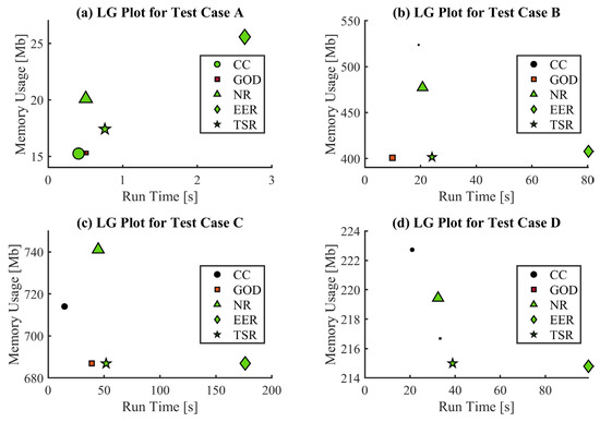 A novel plot is proposed to compare stitching algorithms and to solve this multi-objective optimization problem graphically: the stitching gain lift plot or, shorter, the SGL plot. Memory usage is plotted as a function of the stitching run time. The size of each marker is inversely proportional to the mean repositioning error, so that a bigger marker indicates a lower mean repositioning error. The marker color depends on the value of the stitching error estimator: it is green if the stitching error estimator value is the best, red if the value is the lowest, and black if the stitching has failed. With the SGL plot, the best stitching algorithm to use for each test case would be closer to 0 in run time and memory usage, has a larger marker size and, preferably, a green color. The SGL plot is a simple tool allowing users to select the best stitching algorithm for a given elementary topographic dataset. In addition, all results from the five criteria for each test case are contained in this single plot, making it a good sum up plot for the comparison of 3D topography stitching. Figure 17 shows the SGL plot for each test case, and the stitching algorithm is indicated by the marker shape.