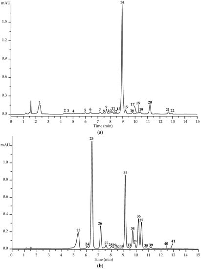 Successful separation and identification of 41 compounds in K. centauroides leaf extract were achieved after the polyamide solid phase extraction (SPE) procedure, followed by high-performance liquid chromatography with a photodiode and electrospray ionization triple quadrupole mass spectrometric detection. The application of SPE resulted in the isolation of the SPE-1 fraction enriched with non-absorbed compounds (e.g., phenols (1–4) and ecdysteroids (5–22)) and the SPE-2 fraction containing absorbed compounds such as caffeoylquinic acids (23–25, 33–35), flavonol glucuronides (26–32, 36–38), and acylated flavonol glycosides (39–41) identified after comparing retention times, ultraviolet and mass spectra with the reference standard and literature data [47,48,49,50,51,52,53,54] (Figure 1, Table 1).
