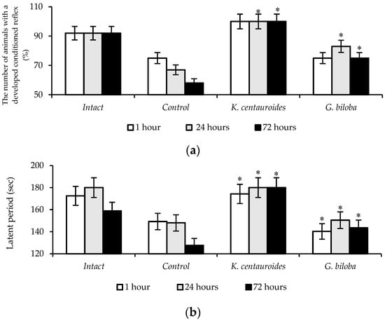 The scopolamine model was used to assess cognitive impairments that occur against the background of cholinergic deficiency. The study of cognitive functions revealed that, after 1 h, passive avoidance learning was formed in 75% of the animals and remained on the 3rd day only in 58% of the animals in the control group. The latent period of entry into the installation dark compartment in the control group for all periods of observation was significantly lower as compared to that in the intact group (Figure 2). The introduction of the K. centauroides extract, the passive avoidance reflex had manifested in 100% of the animals in 1 h and, in 75% of the animals receiving the G. biloba extract. When tested after 24 and 72 h, the passive avoidance reflex was preserved in 100% of animals (p ≤ 0.05) treated with K. centauroides extract, and the latent period was higher by an average of 1.3 and 1.5 times, as compared to the control. The extract of G. biloba after 24 and 72 h retained passive avoidance reflex in 83% and 75% of the animals, respectively (Figure 2).
