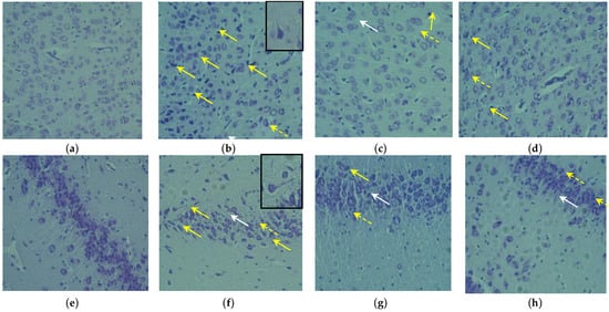 Cerebral cortex (a–d) and hippocampus (e–h) in rats with long-term scopolamine exposure: intact group (a,e), control group (b,f), K. centauroides (100 mg/kg; (c,g)) and G. biloba (100 mg/g; (d,h)). Stained with cresyl violet. Magnification ×200. Solid yellow arrow—pycnotic neurons; white arrow—cytolysis of neurons; yellow dotted arrow—satellite; in insets–thinning dendrites.