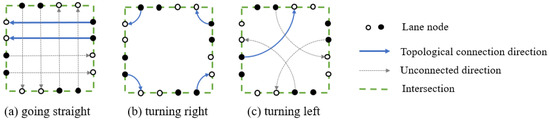 where P l , i is the set of lane nodes at the intersection, and T l denotes the topological relationship of different lane nodes at the same intersection. The lane-level topology relationship is represented according to the traffic rules at the intersection, including straight ahead, left turn, and right turn as well as unconnected lanes, as shown in Figure 2.