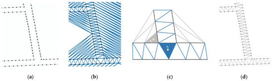 In general, the densification step is related to lane width, which can be set to 3–3.75 m. Considering the smoothness of the following road centerline connection, the road point densification step is set to 3 m in our experiment. The Delaunay triangulation is to be constructed using the point-by-point insertion method, and the schematic diagram of the construction is shown in Figure 3b. The basic idea of this method is to first find the minimum convex hull boundary containing the data region, then build the initial triangular network in it, and finally insert all the remaining points into the triangular network one by one [35] to ensure that it retains the Delaunay triangulation.