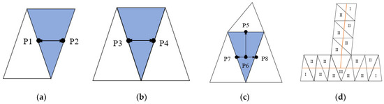 The road centerline is composed of the road triangle centerlines. For type I triangles, the midpoint of one neighboring side and the midpoint of the longer side of the other two sides are calculated (e.g., P1 and P2 in Figure 6a). The two points are then connected to form the triangle centerline. For type II triangles, the midpoints of two neighboring sides are identified (e.g., P3 and P4 in Figure 6b). Then, P3 and P4 are connected to form the triangle centerline. For type III triangles, the gravity center of the triangle is first calculated (as P6 in Figure 5b), and the midpoint values of the three common sides are extracted (as P5, P7, and P8 in Figure 6b), and then, the center of gravity is connected to the other three points to form the centerline.