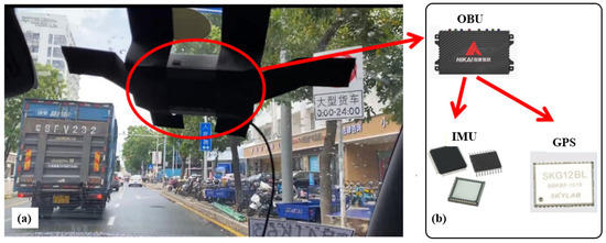 Figure 13. Experimental platform. (a) Installation of the equipment; (b) Detailed components of OBU.