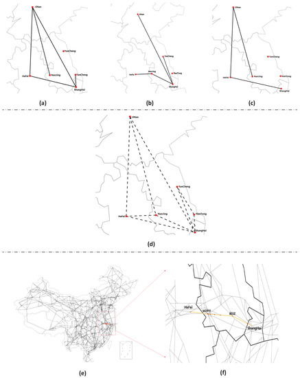 To illustrate the mapping relations of the three-layer air transport networks, Figure 3 gives a simple example with only six cities, JiNan, HeFei, YanCheng, NanTong, NanJing, and ShangHai. Figure 3a–c show the flight operation network in the time intervals of 9:00–10:00, 18:00–19:00, and 21:00–22:00, respectively, which are constructed on the timetable of flights in 2019. Figure 3d shows the city-pair airline network among these six cities, where nine direct airlines exist, including “Shanghai → Hefei”, “Shanghai → Nanjing”, “Shanghai → Nantong”, “Shanghai → Yancheng”, “Shanghai → Jinan”, “Jinan → Hefei”, “Jinan → Nanjing”, “Nanjing → Hefei”, and “Jinan → Hefei”. From Figure 3a–d, we can see that the flight operation network must be the sub-graph of the city-pair airline network, because the flights can be allowed only if there exists a corresponding airline between the cities. Figure 3e is the air route network of China, and Figure 3f shows the routing path “Hefei → WZPYI→ BSSZ → Shanghai” on the air route network for the city-pair airline “Hefei → Shanghai”.