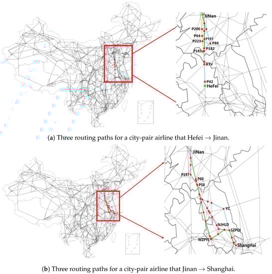 Generally, a city-pair airline (or a pair of airports) in an airline network may correspond to multiple routing paths on the air route network as shown in Figure 4. In Figure 4a, given a city-pair airline from Jinan to Hefei, there are three candidate routing paths on the air route network, including