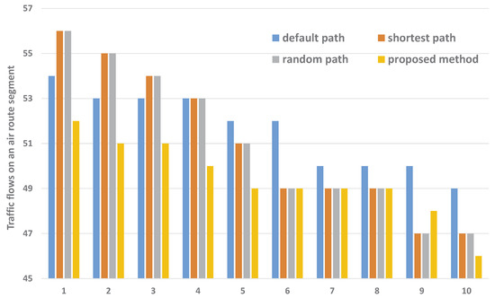 To further demonstrate the effectiveness of the proposed optimization method, we also provide the first ten air route segment traffic flows in time interval 9:00–10:00 under different routing paths strategies, as shown in Figure 6. As shown in Figure 6, the proposed method could reduce the first ten traffic flows of air route segments on the whole, such that the congestion of some air route segments could be alleviated. In time interval 9:00–10:00, the maximum traffic flows of air route segment in the proposed method could be reduce the number of flights by two, four, and four, respectively, when compared with “”, “” and “”.