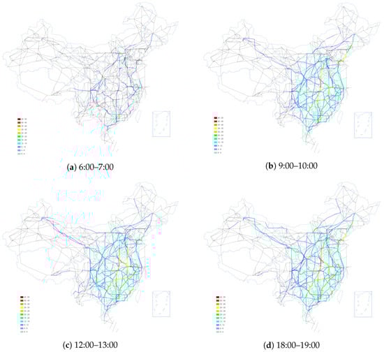 In addition, Figure 7 shows the distributions of traffic flow on air route network for different time intervals, where the routing paths for airlines were selected based on the proposed simulated-annealing method.