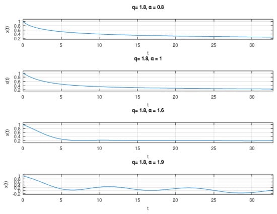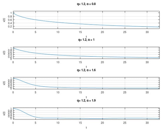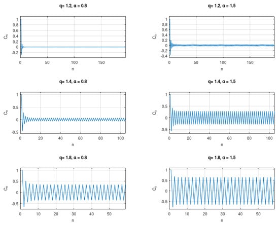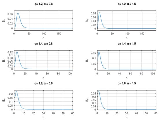 In Figure 2 we depict some plots illustrating the variation of the sequence for several values of and q. As seen, above a given , the sequence becomes negligible, implying that the series solutions (18), or (24), have a finite number of meaningful terms, so that they can be truncated, disregarding the terms for This means that the solution of (3) can be approximated by a finite linear combination of Mittag–Leffler functions.