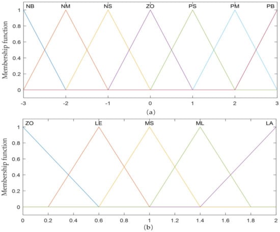 A single-output and double-input fuzzy controller is established in this study, i.e., the sliding variable () and its derivate () are the inputs, and is the output. The universes of discourse for , and are arranged as [0; 1] and [1; 40]. The fuzzy rules define NB, NM, NS, ZO, PS, PM, and PB to represent negative large, negative medium, negative small, zero, positive small, median, and superficial, respectively. Z, LE, MS, ML, and LA denote zero, small, medium, medium, and large, respectively. The fuzzy rules are shown in Table 2 and Figure 3. The fuzzy logic controller was designed using the fuzzy logic toolbox in MATLAB 2018b.