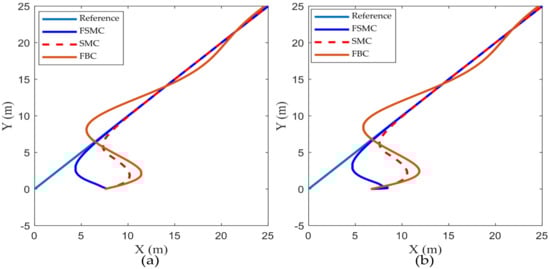 The driving trajectories of the tractor-trailer: (a) FSMC; (b) SMC.
