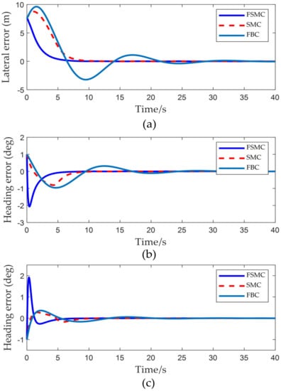 The tractor could be brought online at a distance of 10–20 m thanks to the FSMC, whose maximum steady-state absolute error was between 0.39 and 0.53 m. However, for SMC, the maximum steady-state absolute inaccuracy of the tractor was between 0.38 and 0.75 m, and it also overshot during the process of getting online because it was constructed based on the constant speed-reaching law. It also led to the overshoot for the trailer and the main reason was the chattering problem. The FSMC could keep the absolute value of the lateral error within 0.09–0.17 m. The experimental results show that, compared with the traditional SMC, the steady-state tracking accuracy of the trailer improved by about 10.5–36.8% and the steady-state tracking accuracy of the trailer improved by about 11.1–50%.