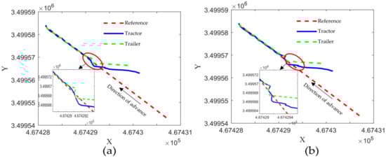 The path tracking trajectories of the tractor-trailer: (a) the trajectory of the tractor; (b) the trajectory of the trailer.