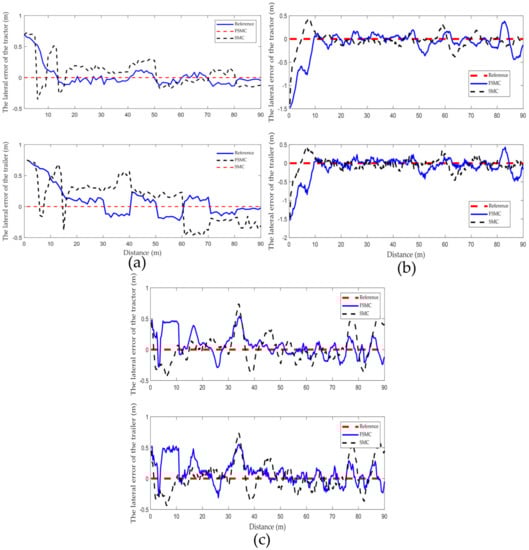 The lateral errors of the tractor and trailer in three tests: (a) Test 1; (b) Test 1; (c) Test 3.
