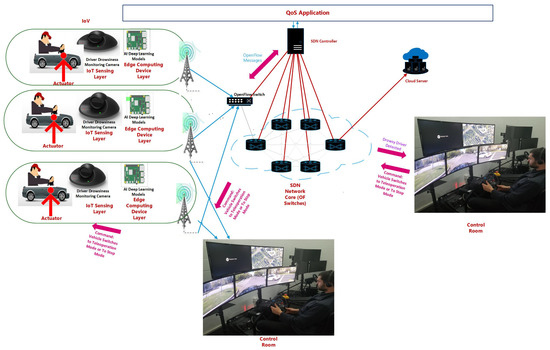 Motivated by the important role IoT and autonomous vehicles technologies play in intelligent transportation systems nowadays and the requirements of safety and emergency-related service in terms of low latency and high reliability, our aim in this research is to develop a framework that ensures the safety of passengers by deploying a deep-learning model at the edge (in a vehicle) that detects a drowsy driver and propagates this information message with QoS required for this type of information message by leveraging the SDN to the remote control center (RCC) to switch the autonomous vehicle to teleoperation mode. The SDN core network satisfies the required end-to-end delay constraint for this delay-sensitive application by exploiting the SDN global view of the network conditions to reallocate the available bandwidth among traffic flows based on the priority of different traffic classes. The SDN controller communicates with forwarding devices using OpenFlow protocol to build this global view. The main contributions of this research are as follows: