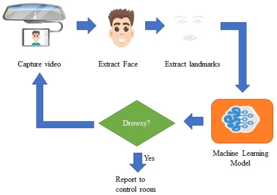 The proposed architecture of driver drowsiness detection and alert is shown in Figure 3, video stream capturing followed by frame selection, face detection, landmarks extraction, and classification. If a driver’s face is discovered, it is detected and cropped from the image using the Viola–Jones [16,17] face detection algorithm before being provided as input to the machine learning phase as facial landmarks. The machine learning algorithm detects whether or not the driver is classified as drowsy at the earliest frame. The input to the machine learning model will be 68 facial landmarks of the face provided by the OpenCV library, and each landmark is presented as an x and y coordinate in the face. Since this is a real-time application, the model needs to be very simple and fast to assure the continuous processing of the frames in minimal time. Therefore, when choosing the model to employ, several famous architectures were not included because of their large number of parameters. Considering the VGG16 [18] architecture with 138M parameters, the lightest version of the Efficientnet-B0 [19] has 5.3 M parameters and the Squeezenet [20] has 421 K. Our proposed dense model, presented in Figure 4, requires training only 5 K parameters making it more suited to real-time applications.