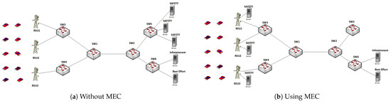 In this scenario, the configuration deployed in [9] is used. This configuration was generated by the SUMO urban mobility simulator, to simulate various levels of congestion over time. In this configuration, one hundred and fifty-eight vehicles move in the 650 m of an urban road in Manhattan (NYC). The Mininet-WiFi emulator and the SUMO simulator were integrated to implement mobility. To evaluate our proposed framework, in this scenario 42 vehicles out of the 158 vehicles generate traffic belonging to different applications simultaneously, whereas 26 vehicles generate traffic for safety applications. This scenario represents a high-traffic scenario to study the impact of a high level of interference on our proposed framework. The parameters used in the performance evaluation are summarized in Table 3. Figure 6 depicts the network setup used in simulation in case of applying the MEC concept to support safety applications prerequisites in terms of ultra-low delay and without applying the MEC concept. The values of RTT are calculated using the “PING” ICMP messages. Table 4 illustrates the average RTT results in the case of applying our proposed Adaptive Quality of Service (AQoS) algorithm and in the case of a QoS-free model in this high-level interference scenario. Our algorithm achieves an improvement of up to 74.63% in terms of average RTT in the case of safety applications and up to 90.88% in the case of infotainment applications. The high improvement in average RTT in the case of infotainment as the infotainment applications have a priority class 2 and are assigned a bandwidth greater than the best effort class and in case of this class is hungry for bandwidth, it collects the free bandwidth from other classes. On the other hand, the improvement in safety applications is less as in both cases the safety servers are connected directly to RSUs applying the MEC concept of 5G to support ultra-low delay application. Moreover, results revealed that the usage of MEC technology improves the average RTT by up to 98.09%. Finally, without applying the MEC technology and moving safety servers to the SDN network core, our proposed AQoS still improves the performance by up to 64% compared to the QoS-free model.