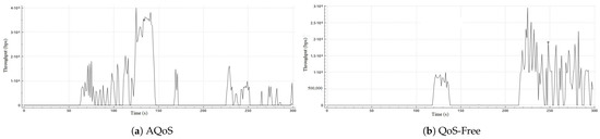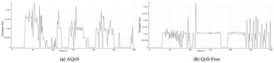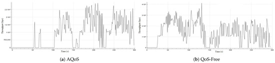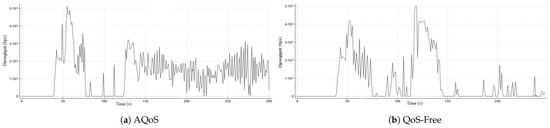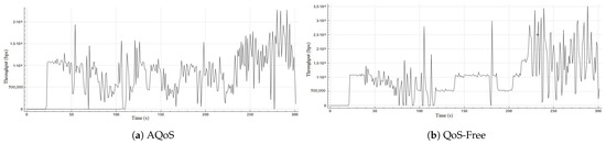 Figure 11, Figure 12, Figure 13, Figure 14 and Figure 15 shows the throughput in case of moving the safety servers to be connected to the network core (SW5). The results show an average aggregate throughput of 1.251 Mbps for all safety traffic in the case of applying our proposed AQoS algorithm against 1.01 Mbps in the case of a QoS-free model with an improvement of up to 19.26%. Moreover, the results revealed an average aggregate throughput of 2.18 Mbps for all infotainment traffic in the case of applying our proposed AQoS algorithm versus 1.13 Mbps in the case of QoS-free model with an improvement of up to 48.17%.