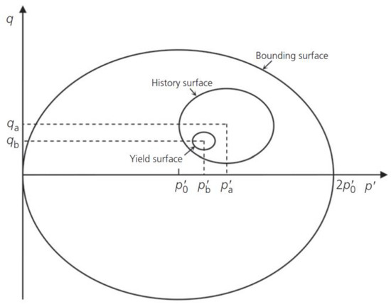 The 3SKH (three-surface kinematic hardening) model of Stallebrass and Taylor [7] (Figure 1) was also used to model natural London clay. Apart from the yield surface and bounding surface, the third history surface is defined as an envelope of points where the stiffness no longer depends on the previous loading history. Both the BRICK and 3SKH models were used effectively to model the behaviour of London clay, notwithstanding that neither of the two models expressly account for the effects of anisotropy and structure. The 3SKH model was improved by Grammatikopoulou et al. [35], further referred to as the M3-SKH model, for the generalised three-dimensional (3D) stress state. The improvement contained a different hardening modulus, to model a smooth elastic–plastic transition, compared to the original 3SKH formulation, in which a marked drop in stiffness occurred once plasticity was engaged. Yeow and Coop [32] compared laboratory triaxial data on London clay from Gasparre et al. [28] with the predictions of the original BRICK and M3-SKH models, highlighting the advantages and deficiencies of both models.