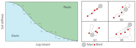 Analogy of the BRICK model: (a) bricks in line behind the man when he continues in the same direction—fully plastic behaviour; (b) bricks initially do not move when the man turns back—fully elastic behaviour; (c) bricks with shorter strings start to move, followed by those with longer strings; (d) bricks initially move in the same direction when the man turns 90° (adapted from Simpson [8] by [32]).
