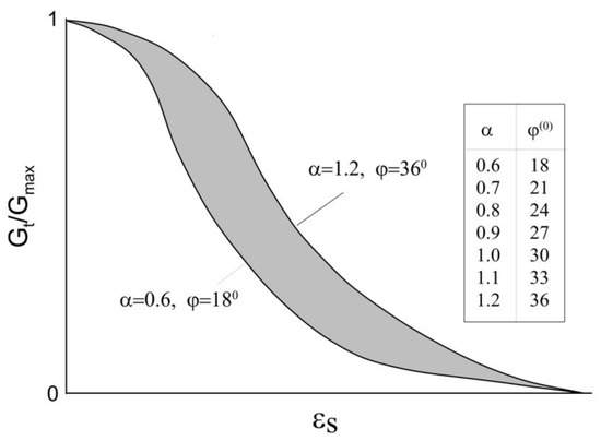 Given that the area under the S-shaped curve is proportional to sin ϕ′, this modification directly influences the value of the maximum angle of the shearing resistance, i.e., the strength response of the model. The applicable range of for natural materials was chosen so that the angle of shearing resistance lies within the range from to for the normally consolidated states (Figure 3).