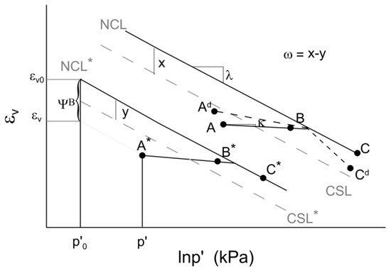The concept of is graphically represented in Figure 4 in the plane, in which NCL and the critical state line (CSL) are shown for a structured and a reconstituted sample (marked with *). Its effect can easily be understood as an increase in the distance between the normal compression line and the critical state line in terms of volumetric strain as a consequence of structure, in comparison with that distance on the reconstituted material. This increase in distance and the apparent overconsolidation of the soil are directly superimposed.