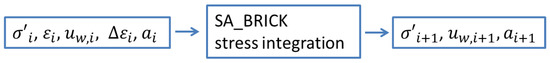 The main model input variables at the beginning of each step of loading in the global Newton–Raphson iteration are stress , strain , pore pressure , state variables , as well as the iterative strain increment . According to the given iterative strain increment coming from the main PLAXIS core routine, the implemented model integrates the stresses , pore pressure and state variables at each iteration which represent the output variables, as schematically presented in Figure 6 for the SA_BRICK model. The stress integration is performed by applying the strain increment Δεi on the current setting of bricks in strain space while running algorithms to iteratively move bricks and accumulate stresses along the elastic strain increments. In this procedure the proper string lengths must be considered along with all the changes of the state variables and iterative corrections. More details on BRICK implementation can be found in [17,44], while the use of PLAXIS user-defined soil models can be found in [19].