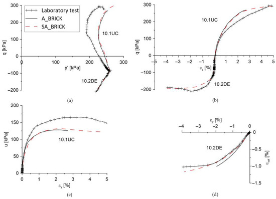 Validation of the SA_BRICK model against the A_BRICK model [44] on laboratory samples 10.1UC and 10.2DE: (a) q–p′ diagram; (b) q–εy diagram; (c) u–εy diagram; (d) εy–εvol diagram (only for sample 10.2DE).