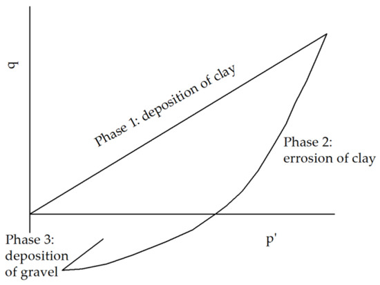 Geological history was evaluated for the given site of Heathrow Airport Terminal 5 [26,47], from where the samples were taken. Generally, the modelling of geological history included the deposition of clay (sedimentation) and the erosion of 175 m of London clay, which was followed by the subsequent deposition of 6 m of gravel (Figure 8). Both structure and anisotropy were modelled after the end of sedimentation and before erosion, which was then followed by the deposition of gravel. Modelling of geological history was followed by the unloading caused by sampling, and after the establishment of the initial stress state through isotropic compression, the exact stress path (e.g., shearing in compression or extension) was modelled as in the triaxial test as used by Gasparre [47].