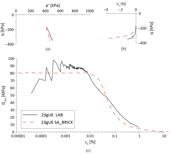 Validation of the SA_BRICK model against laboratory sample 23gUE [47]: (a) q–p′ diagram; (b) q–εa diagram; (c) Gsec–εs diagram.