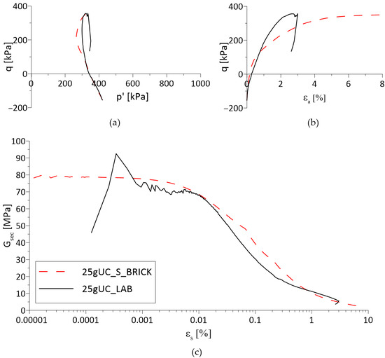 Validation of the SA_BRICK model against laboratory sample 25gUC [47]: (a) q–p′ diagram; (b) q–εa diagram; (c) Gsec–εs diagram.