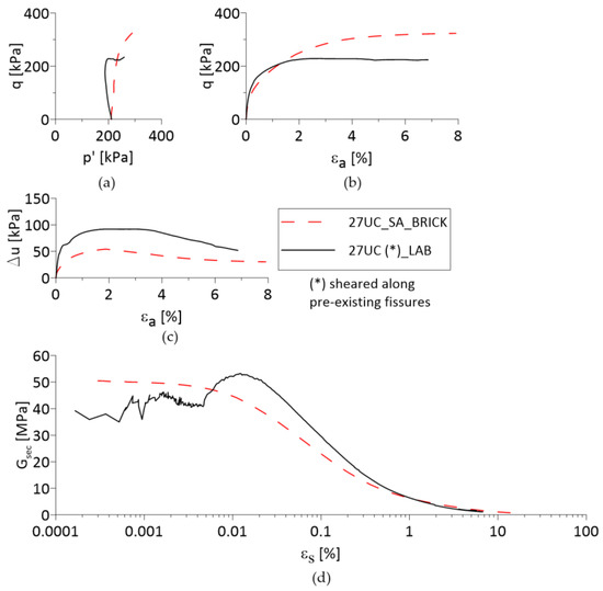 Validation of the SA_BRICK model against laboratory sample 27UC [47]: (a) q–p′ diagram; (b) q–εa diagram; (c) Δu–εa diagram; (d) Gsec–εs diagram.
