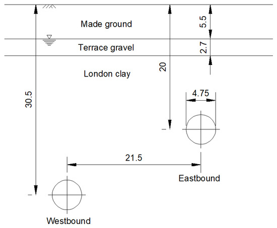 The development of sophisticated measuring devices in the laboratory and in situ resulted in a better understanding of the clay composition and structure (e.g., [21,22,23,24]) and clay shear strength behaviour [25]. A comprehensive overview of the geological history and geotechnical and geomechanical characteristics of London clay is given by Hight et al. [26]. Their work was based on the data obtained from ground investigations for Terminal 5 at London’s Heathrow Airport, which was also the lithological unit used in this research. London clay is a typical heavily overconsolidated marine clay of mineral composition comprising illite, chlorite, kaolinite, smectite and montmorillonite. At the Terminal 5 site, the clay was of high to very high plasticity, in which the plasticity index (PI) averaged around 40% (minimum of 33% and maximum of 49%), while the liquid limit (LL) was between 65 and 70%. The same lithological unit at St. James’s Park had similar index properties, with an average mass water content of 20% to 25% and a unit weight varying between 20 kN/m3 and 22 kN/m3 [27]. The coefficient of permeability of London clay typically varies between k = 1 × 10−9 m/s and k = 1 × 10−10 m/s. In terms of the strength effective stress parameters, the apparent cohesion is characteristically taken as c′ = 0, while the angle of shear resistance ranges from a peak of Φ′ = 25°, to a large strain of Φ′ = 20°, and to residual values of Φ′ = 12° [26].