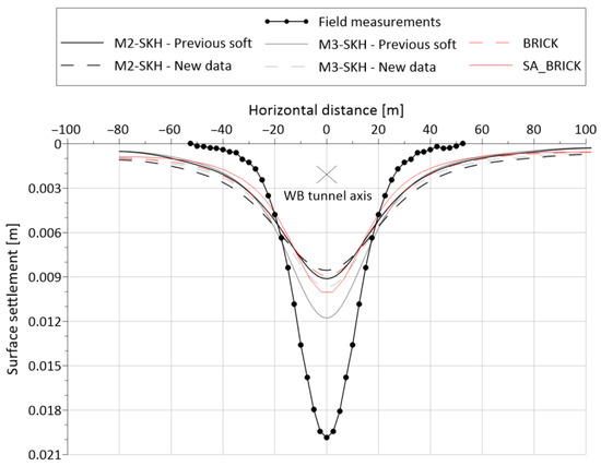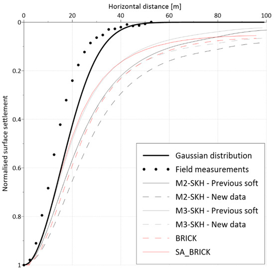 There is also a distinctive difference between the prediction of the BRICK and SA_BRICK models, in which the SA_BRICK model gives a much narrower settlement trough. This result substantiates the appropriate choice of parameters and adequate implementation of both structure and anisotropy in the SA_BRICK model. Apart from that, it can be observed that the field data give a much narrower settlement trough than the Gaussian distribution curve. As already discussed, this fact is attributed by Standing and Burland [27] to an unexpectedly high volume loss at this section of the tunnel.