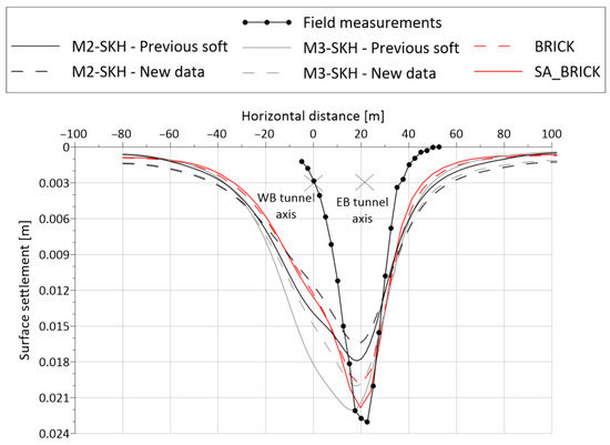 In comparison to the west tube analyses, a better accuracy of prediction could be attributed to the fact that volume loss for the excavation of the east tube was lower so that the total magnitude of displacement of 24 mm is in very good agreement. The analyses also predicted the impact of the ground disturbance initiated by the excavation of the west tube well, which is seen in the asymmetry of the trough. As observed by Standing and Burland [27], a volume loss of 2.4% might be taken as a plausible estimate for the initially undisturbed ground for the construction of the east tube. This is much closer to the expected quantities of volume loss in London clay [58], so the numerical analyses were within the range of expected ground behaviour and gave better predictions.